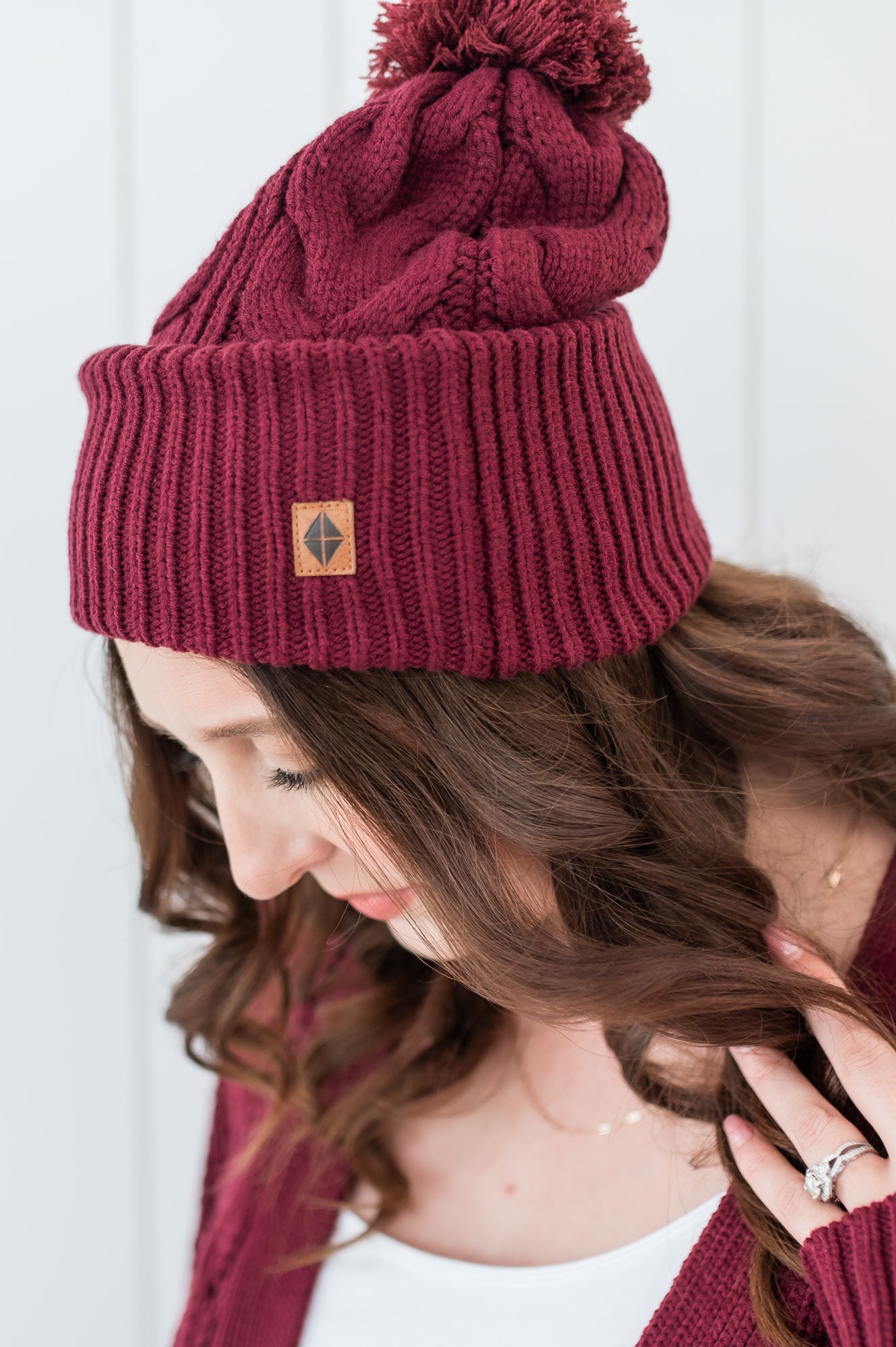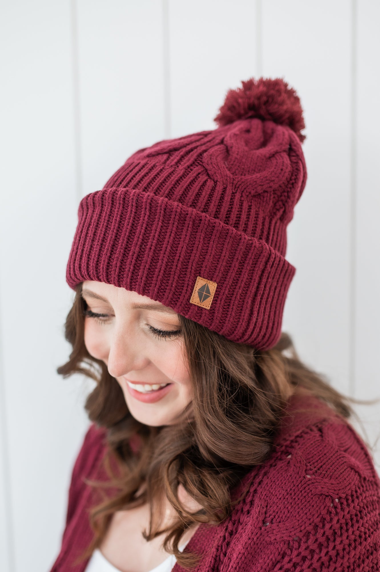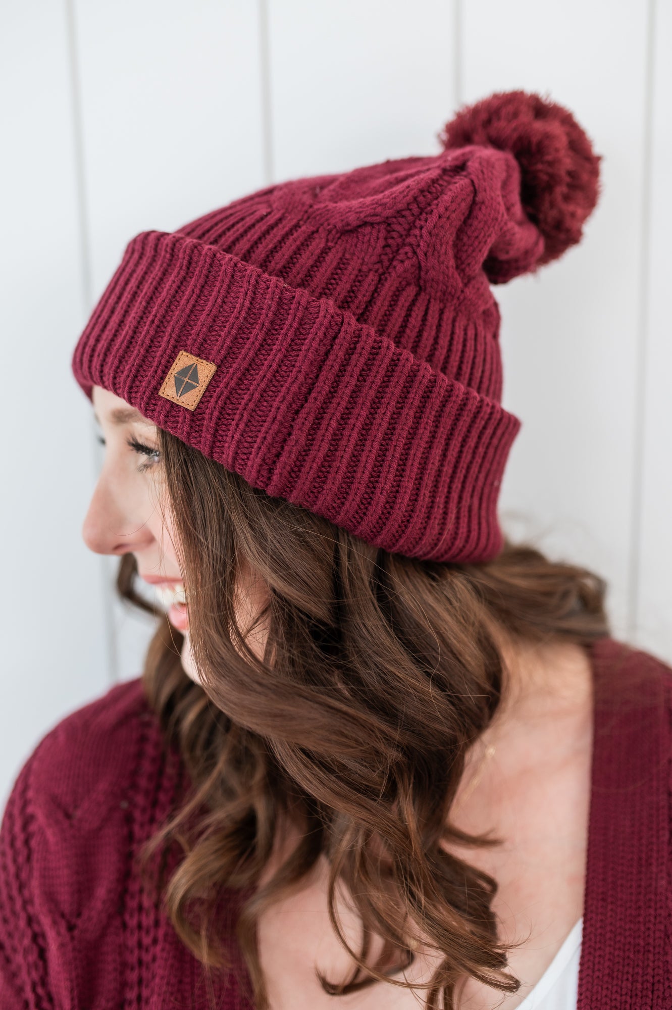 Cable Knit Pom Beanie in Burgundy