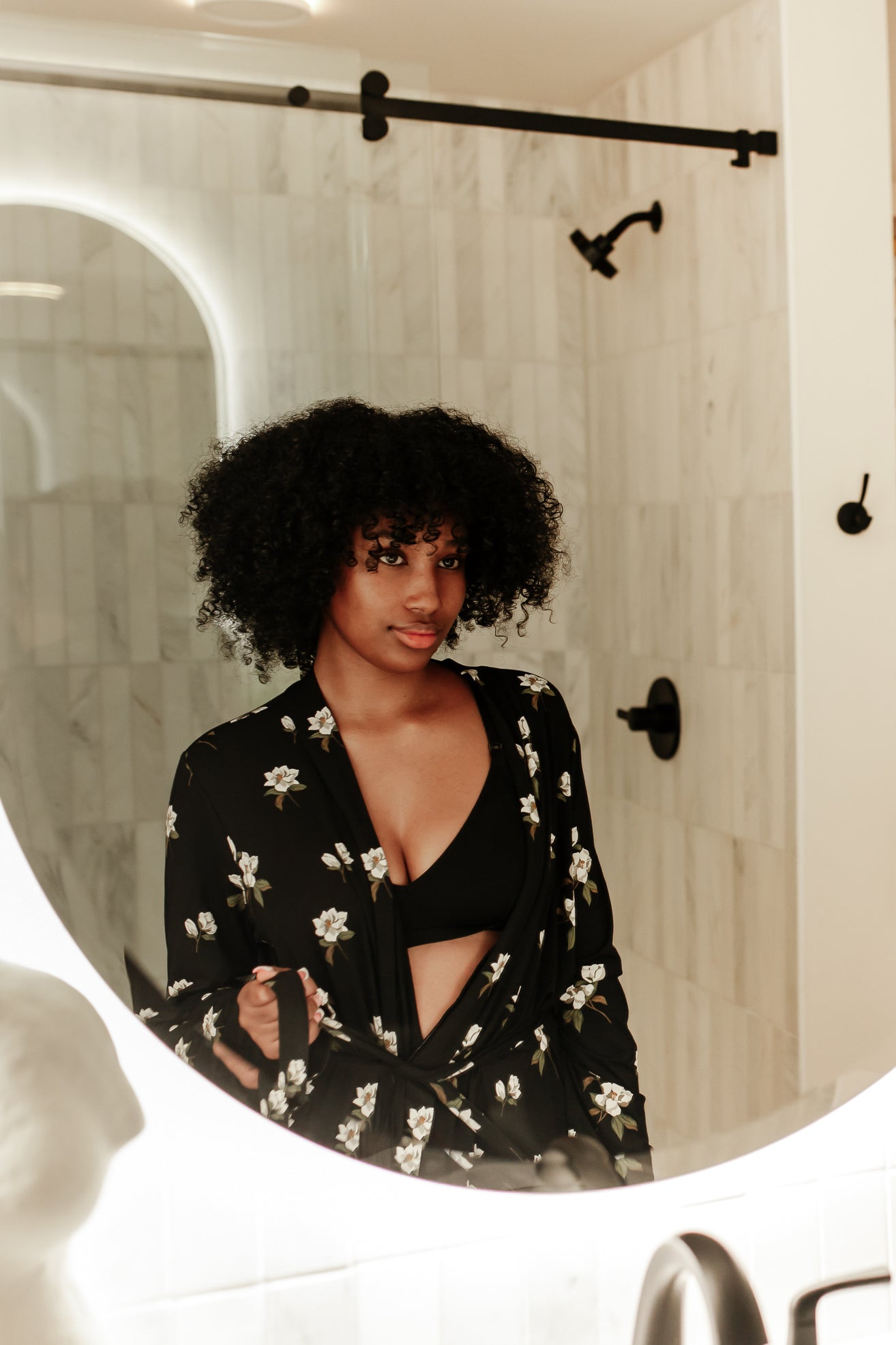 Woman wearing Magnolia printed black robe and black bra in a neutral bathroom