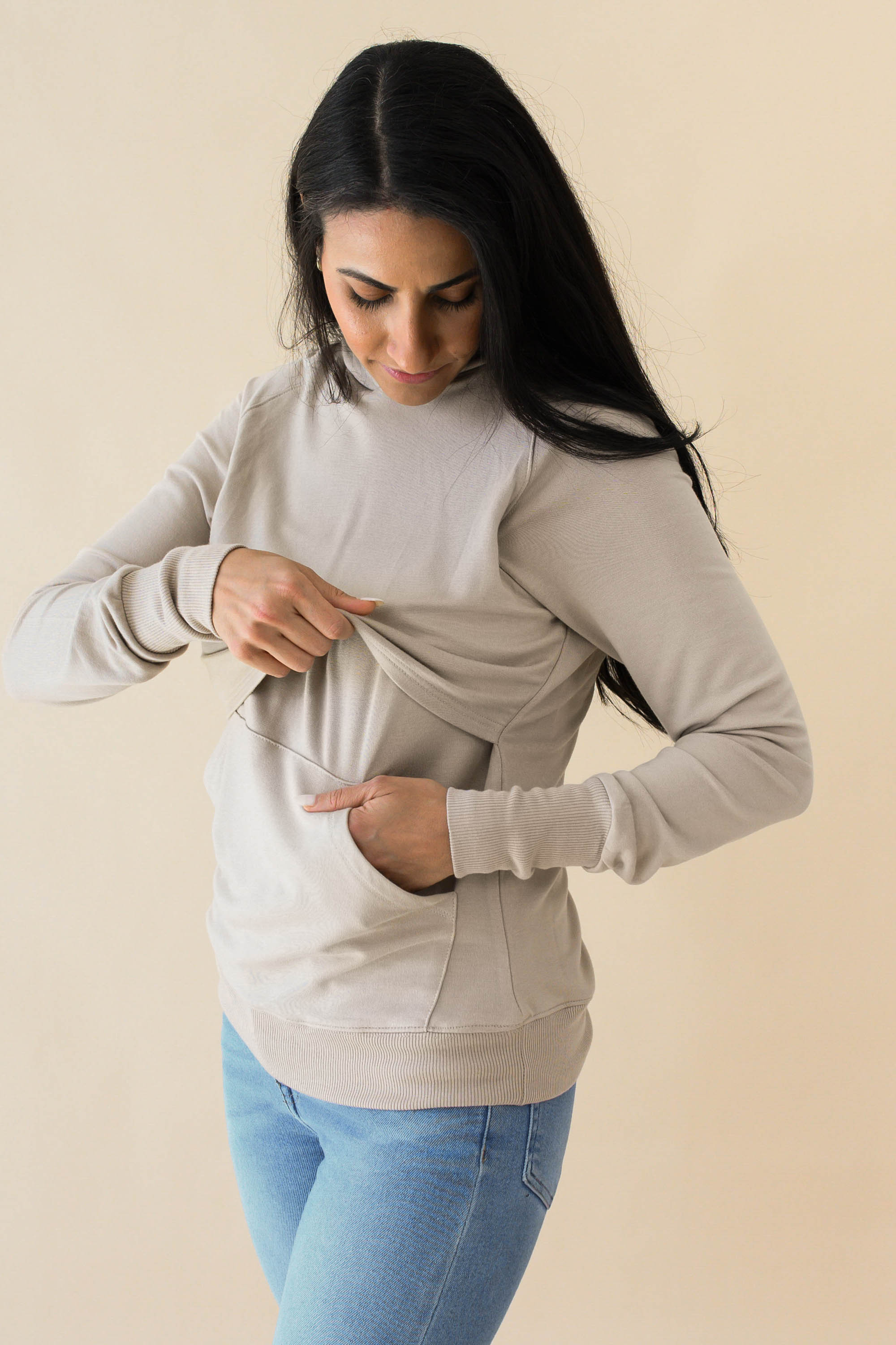 Stay covered and cozy in this soft, nursing-friendly hoodie that’s designed to keep you warm while you breastfeed your baby discreetly. Simply lift up the top panel and pull down the ruched underlayer to feed on the go without the hassle of zippers or a nursing cover. Lightweight for layering and chic for everyday wear, this breathable hoodie is easy to wear—wherever you go. Our custom-milled bamboo french terry feels supremely soft to the touch for your sensitive postpartum skin, and keeps you comfortably warm without ever feeling too hot.