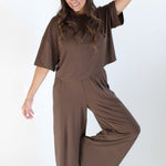 Model sitting while wearing the Women's Wide Leg Pant in Espresso paired with the matching tee